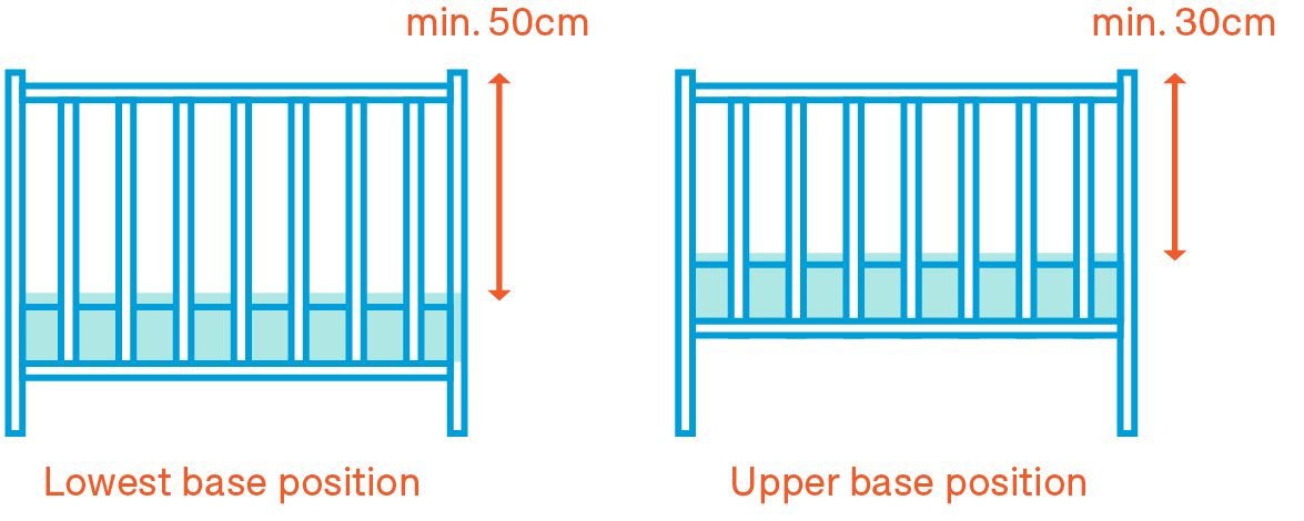 The distance from the top of the mattress to the top of the lowest side when the dropside is closed should be at least 50cm when the base is set in the lowest position. The depth should be 30cm when the mattress base is in the upper position. The depth should also be at least 15cm when the dropside is down.
