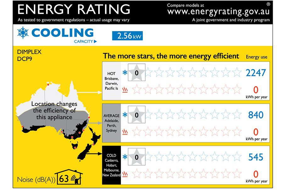 Since April 2020, portable air conditioners have been required to meet Minimum Energy Performance Standards (MEPS) and display a ‘zoned’ energy rating label. This shows energy efficiency according to your location, as well as other things such as how noisy it is, kWh use each year, and cooling capacity.