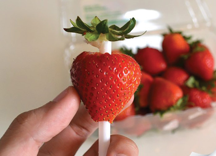 You push a plastic straw through the bottom of the strawberry to the top until the stalk pops out.Â