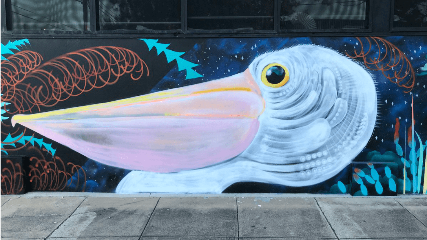 David sees his mural “Waterways” as a way to give back to the lands that raised him and the vibrant communities that call this area home. He carefully researched and considered the flora and fauna chosen for this work, and has chosen to depict species endemic to the local area.