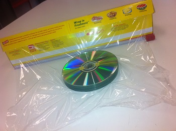 a stack of 12 DVDs or CDs (not in their cases), protectively and tightly wrapped in cling film.