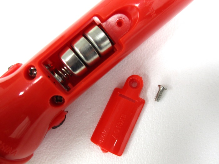The battery compartment of the TNW Dinosaur Torch and Projector is secured with a screw, but it can be removed completely, making it easier to lose.