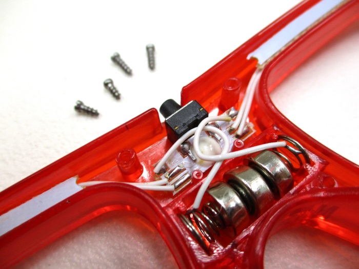 The novelty light-up glasses bought at The Reject Shop have screws that can be removed from the cover.
