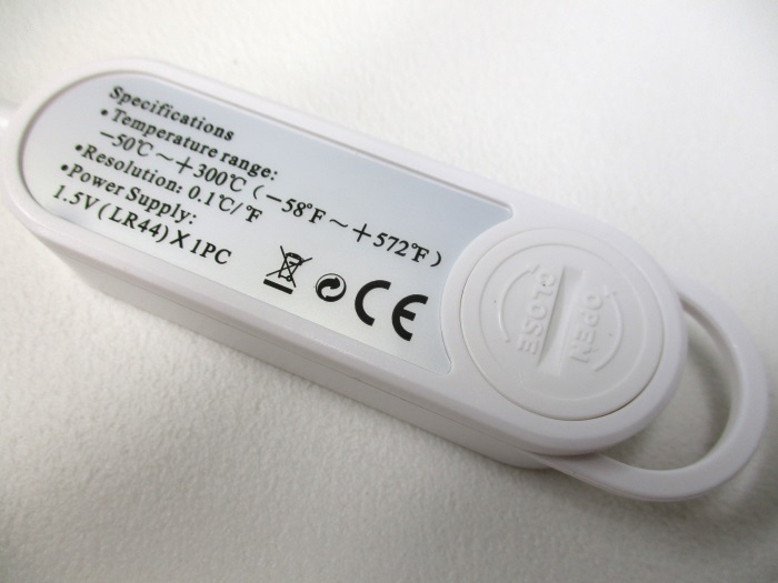 The cover of this unbranded digital thermometer, bought from a Sydney grocery store, can be easily opened, exposing the button battery.