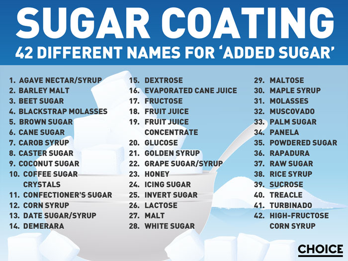 Another thing to be aware of: there’s an incredible amount of trickery involved in actually identifying sugar in an ingredients list. CHOICE has identified a ludicrous 60 different names that essentially amount to added sugar. Everything from panocha to rapadura to [checks notes] turbinado? Are these sugars or Pokemon?