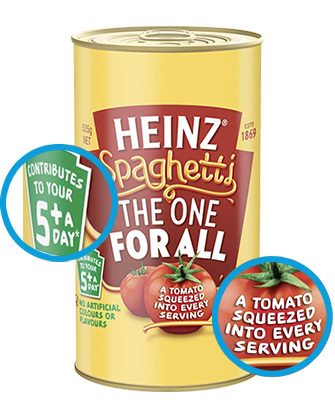 Pack claim: “A tomato squeezed into every serving. Contributes to your 5+ a day*” (“*Contains 3 serves of vegetables per can”)