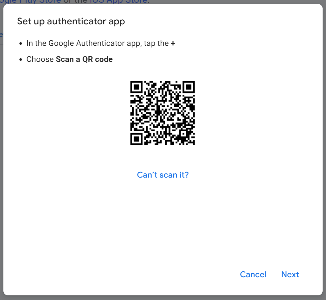 A QR code along with instructions will appear. Download the Google Authenticator app on your phone or tablet, then follow the instructions on your browser to scan the code.