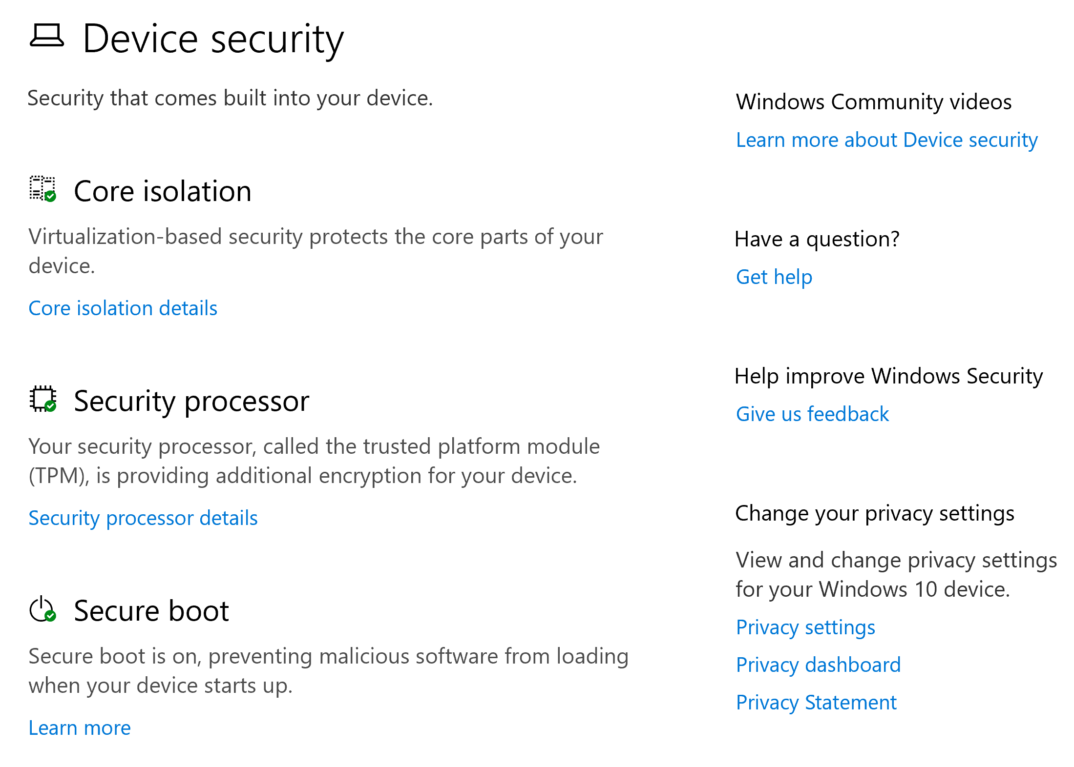 Windows’ Hardware security (also called Device security) is only available to PCs that meet certain requirements, which are: