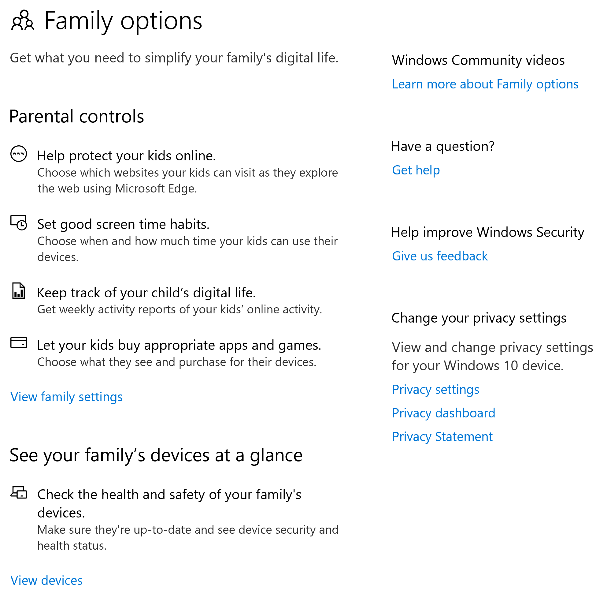 Go to Settings > Update & Security > Windows Security then click Open Windows Security > Family options.