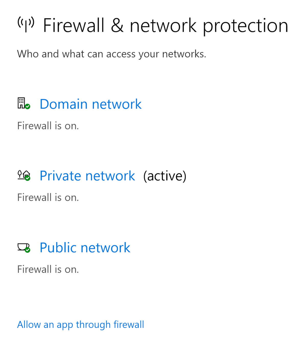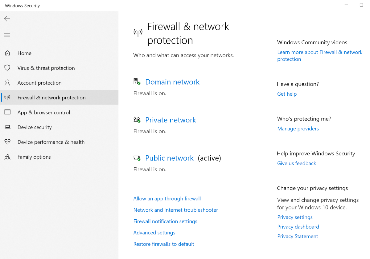 You can turn Microsoft Defender Firewall on or off for three types of networks: Domain (usually a workplace), Private and Public.