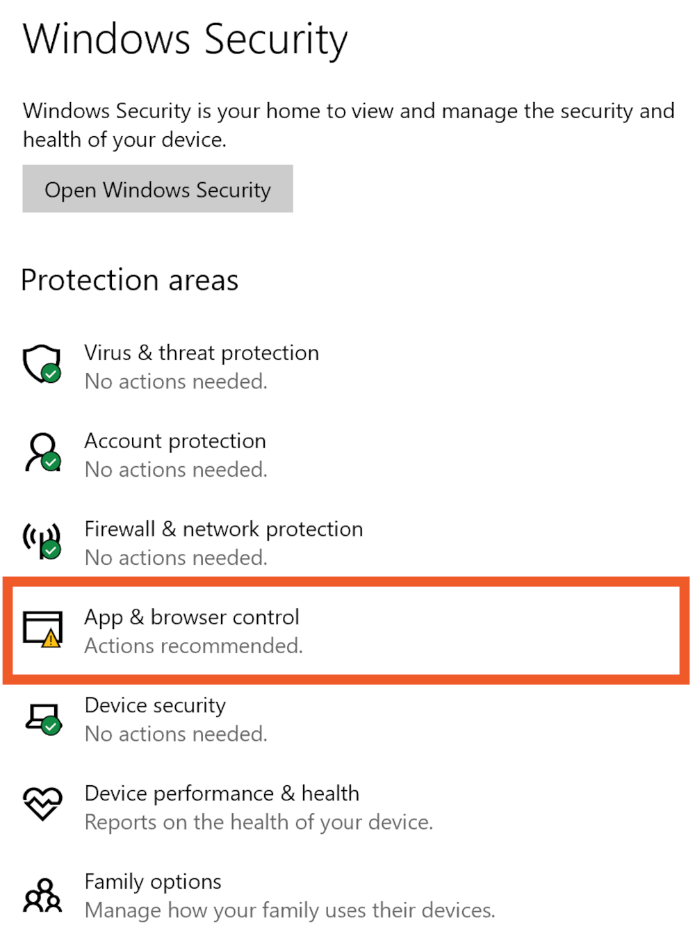 For example, if the app and browser control section has a yellow symbol with an exclamation mark, click on it to find out why.