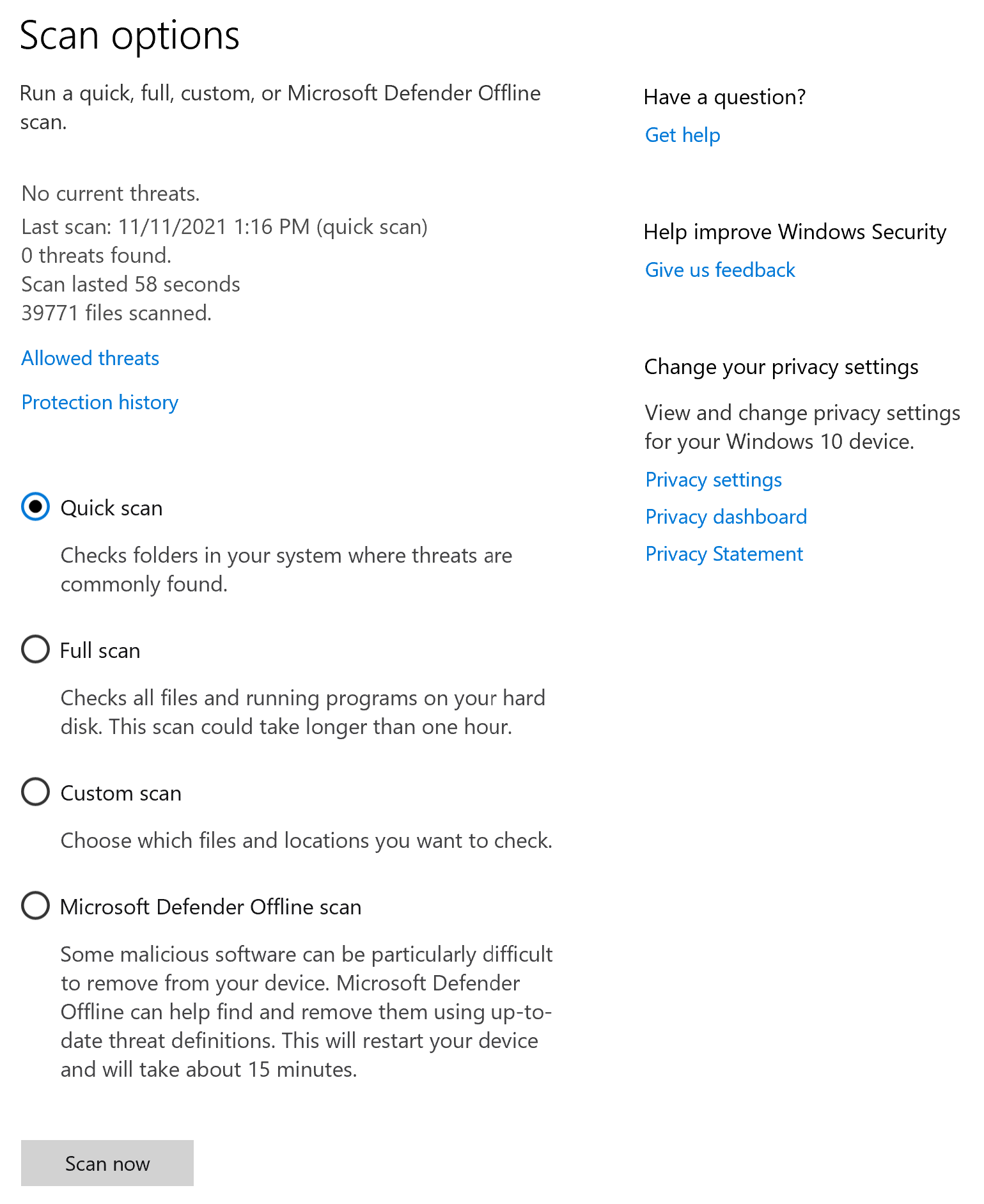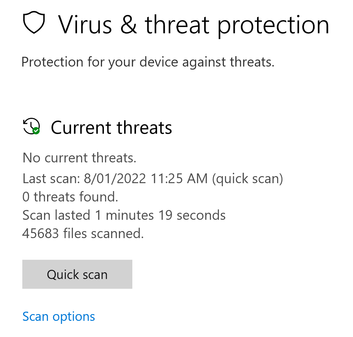 To perform a scan, head to Update & Security > Windows Security > Virus & threat protection. From here, click Quick scan or Scan options if you want something else. Make your choice and click Scan now, but be careful to read the descriptions for each scan type so you know what you’re in for.