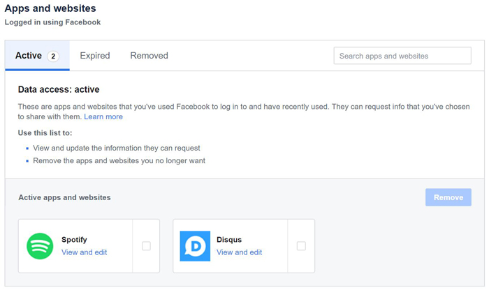 Active apps and websites are ones you’ve logged into within the last 90 days. These can still request from Facebook the information you agreed to share with them when signing up.