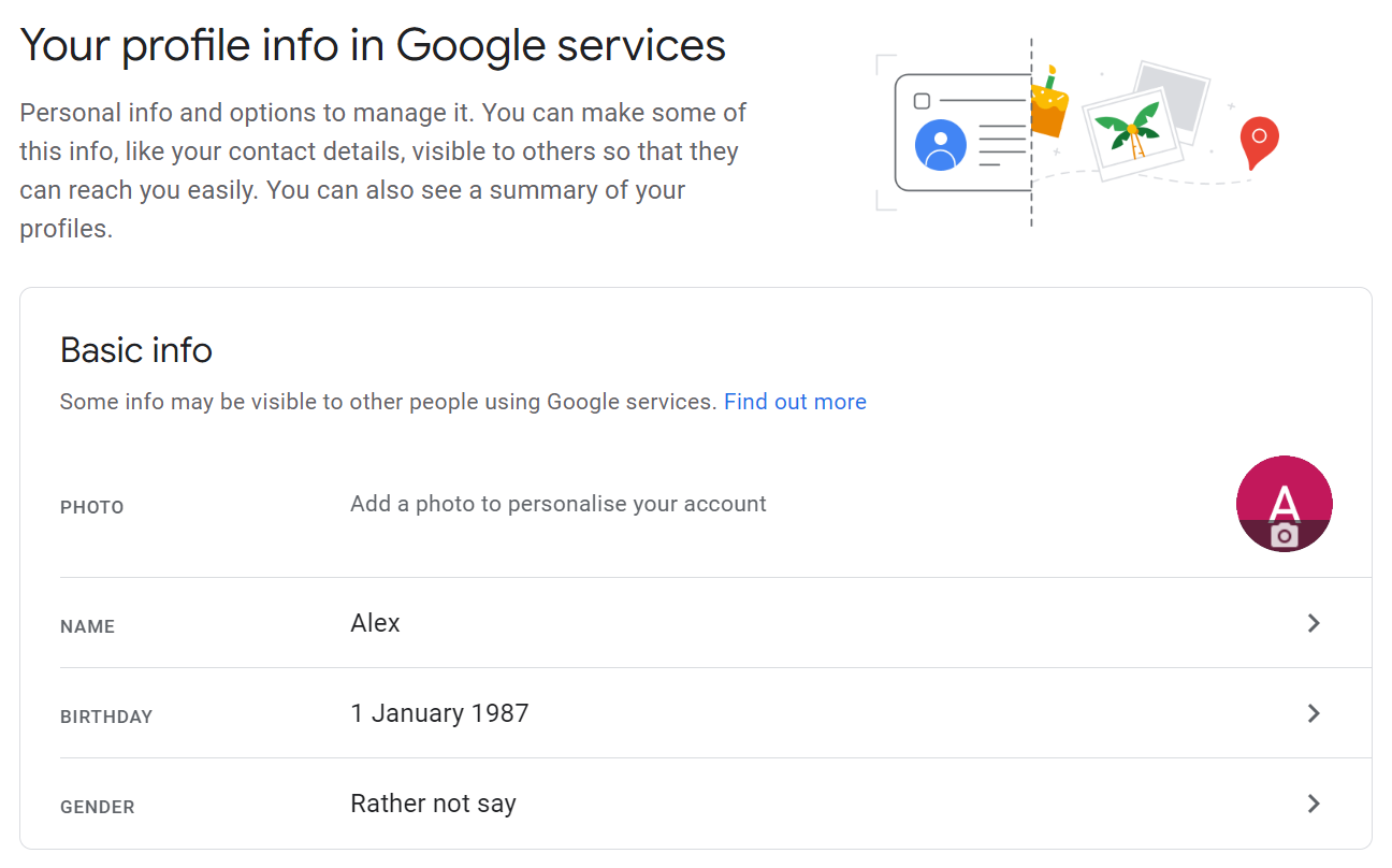 The Basic info section is where you can edit your name, account photo, birthday, and gender.