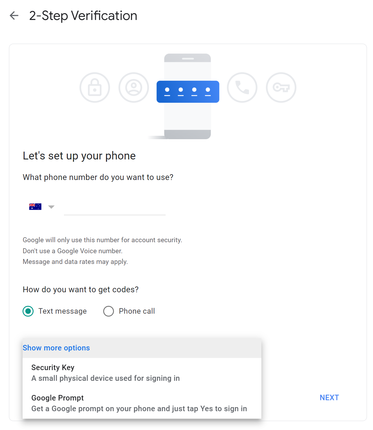 During set-up, Google asks for your phone number, but you don’t have to provide it – if you click Show more options you can choose Security Key (such as a Yubikey) or Google Prompt, which sends a pop-up request to your elected Android phone, as your authentication methods. We only recommend Security Key for the ultra security-conscious.