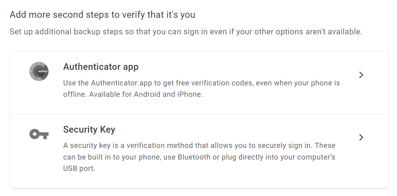 Once you’ve set up 2-Step Verification, you can select additional authentication methods such as the Google Authenticator app.