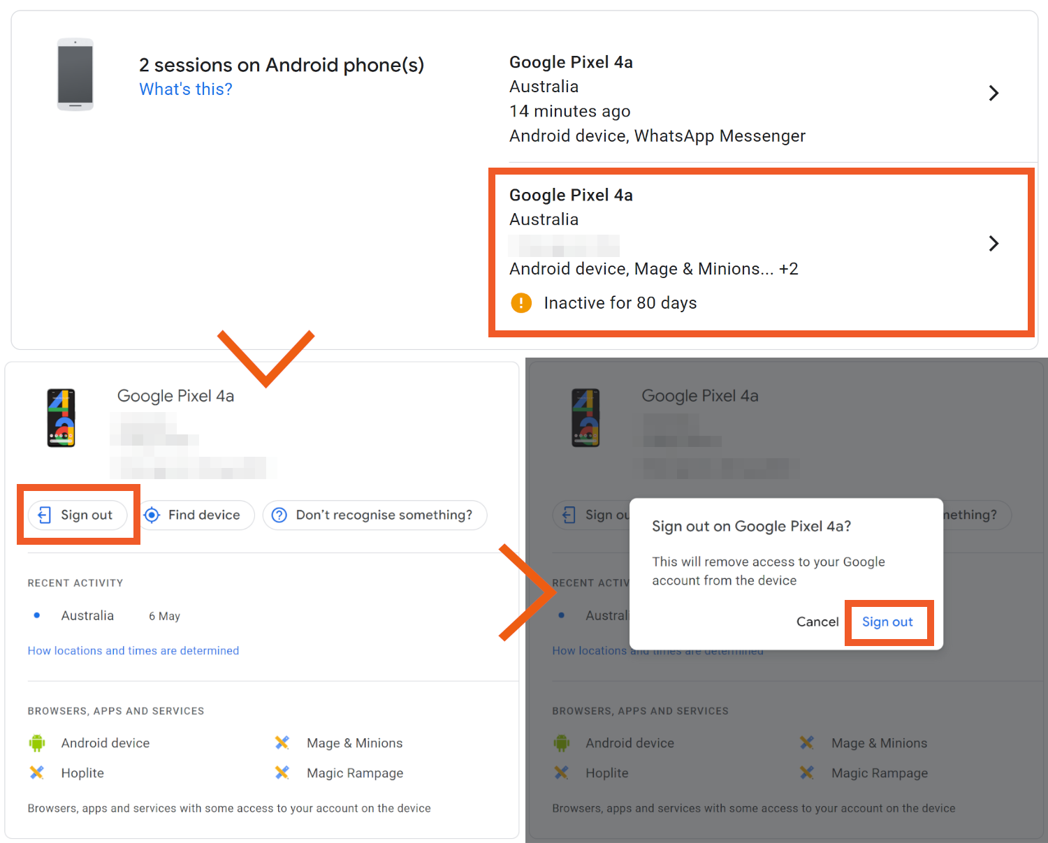 To remove a device, click the on the section including its name and details then Sign out > Sign out. This logs out of your account on that device or browser, but apps on that device might still have access and will need to be managed separately.