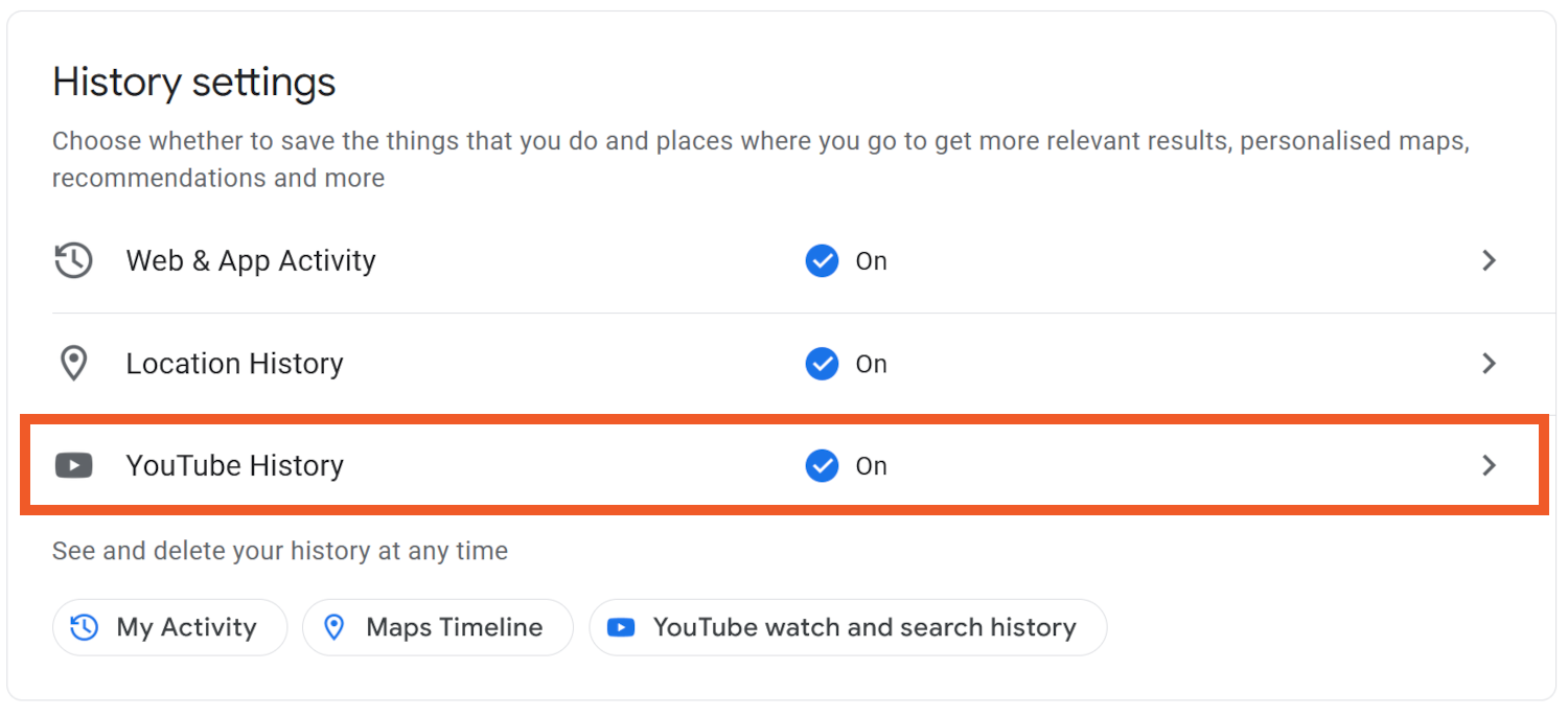 Under History settings, click YouTube History to view your current settings.