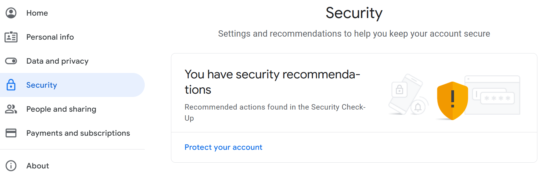 If you have security recommendations, they’ll be listed at the top. Click Protect your account to view them and expand each one by clicking the down arrow on the right. This can be a quick way to cover the important basics.