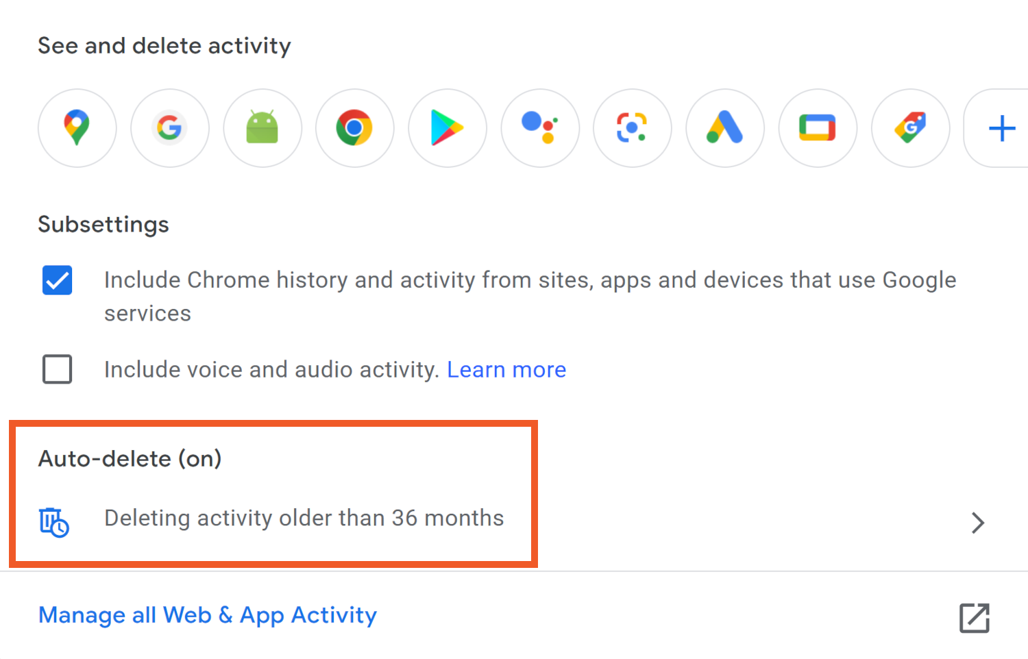 An important setting is Auto-delete, under which it should tell you how long your Google data is kept. You can choose to wipe it clean at three, 18 or 36 months.