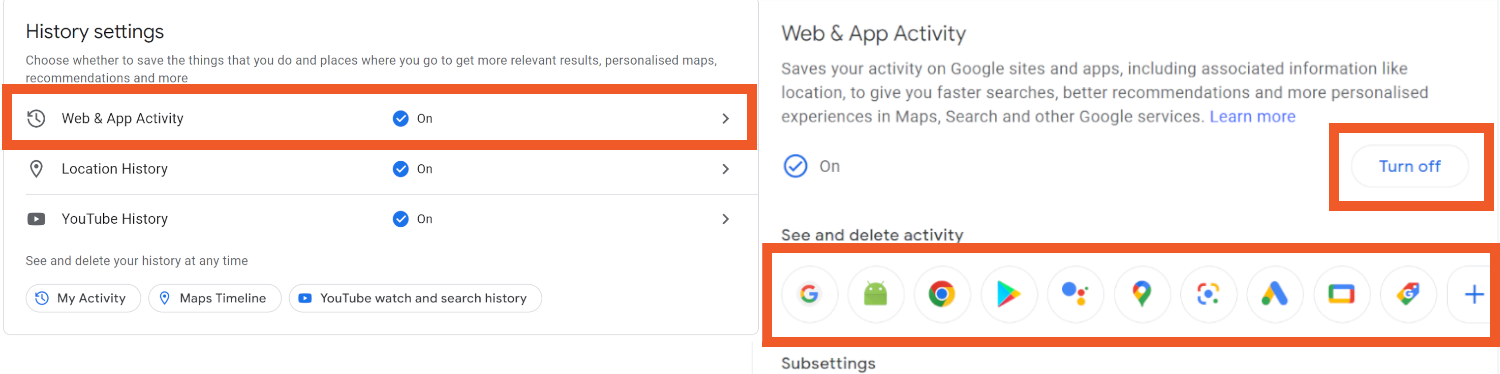 Click Turn off to disable it across all your devices or choose a maximum time Google will store it for, after which it’s deleted.