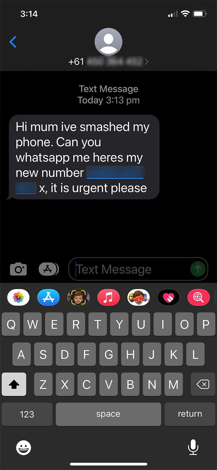 If you’re receiving suspicious messages from a relative, try to reach them using a different method, such as social media or a number you’ve used before. Image: supplied.