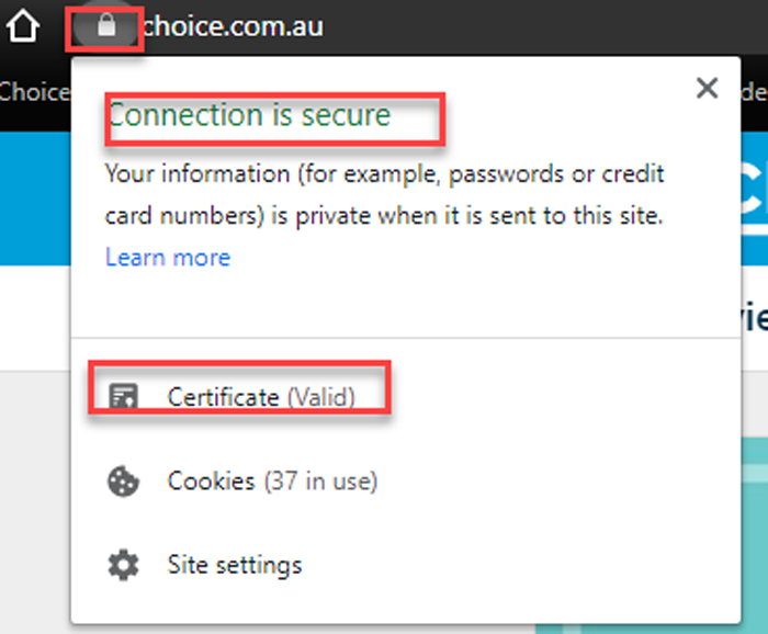 Clicking on the closed padlock icon next to a website’s URL will display some important security information about the site.