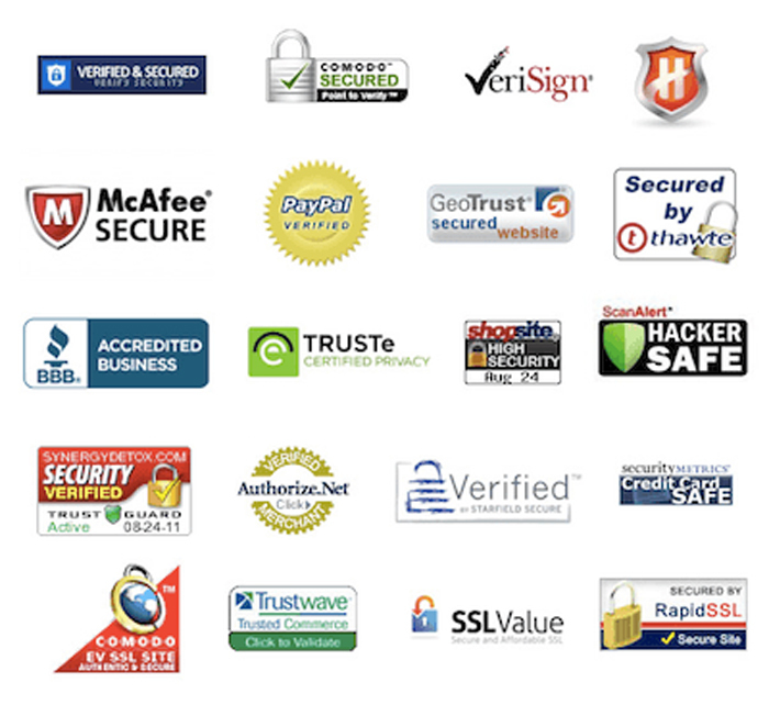 In the world of online shopping, trust seals such as these signify that the payment and brand are legitimate. (Note: this is not a full list – use as a guide only.)