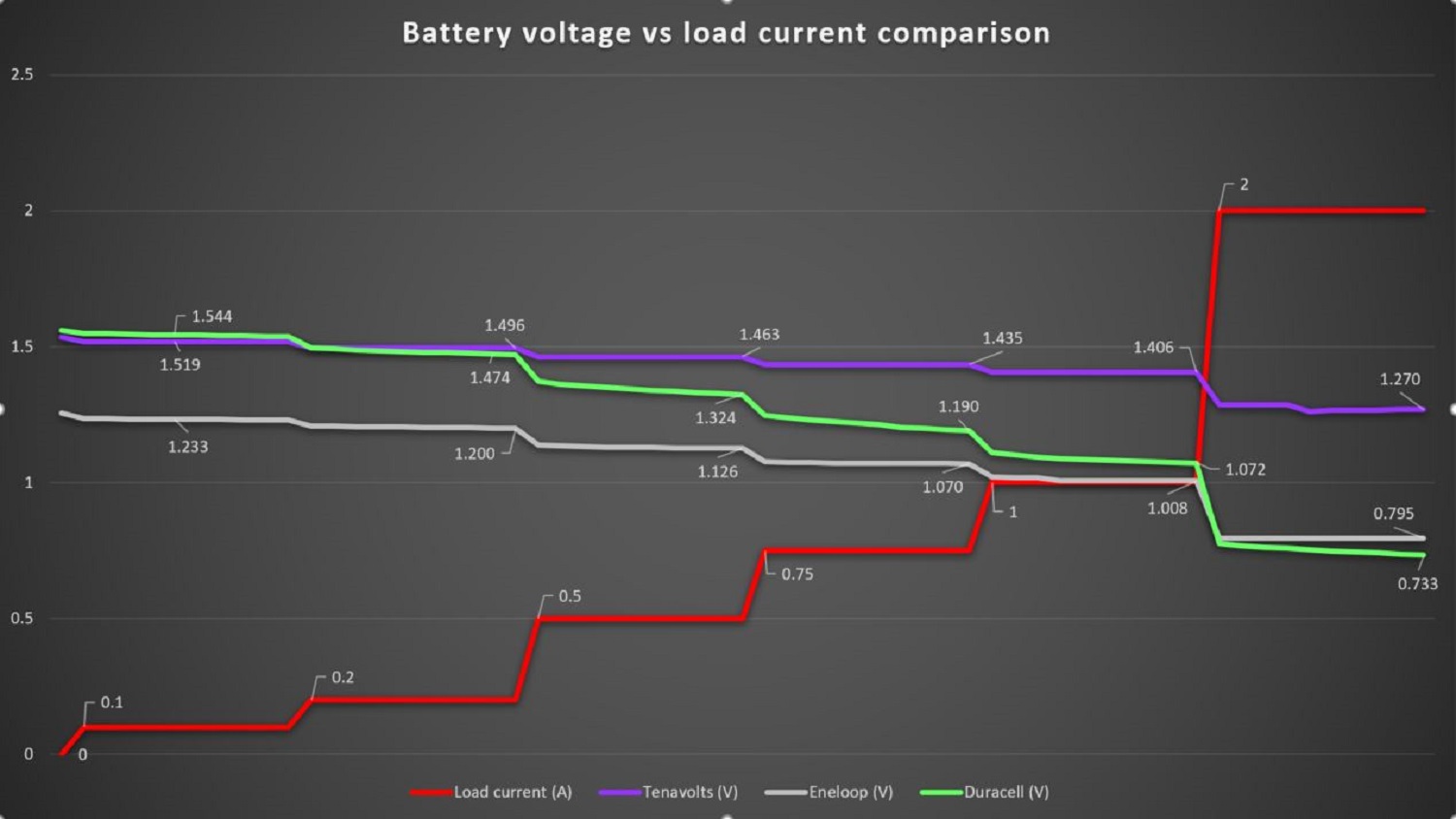 Our tester noted that the overall capacity of the Tenavolts batteries compares well with the Eneloop rechargeable and single-use Duracell alkaline batteries. The impressive voltage regulation of the Tenavolts batteries also makes them more versatile over loads ranging from low (0.1A) to very high (2A).
