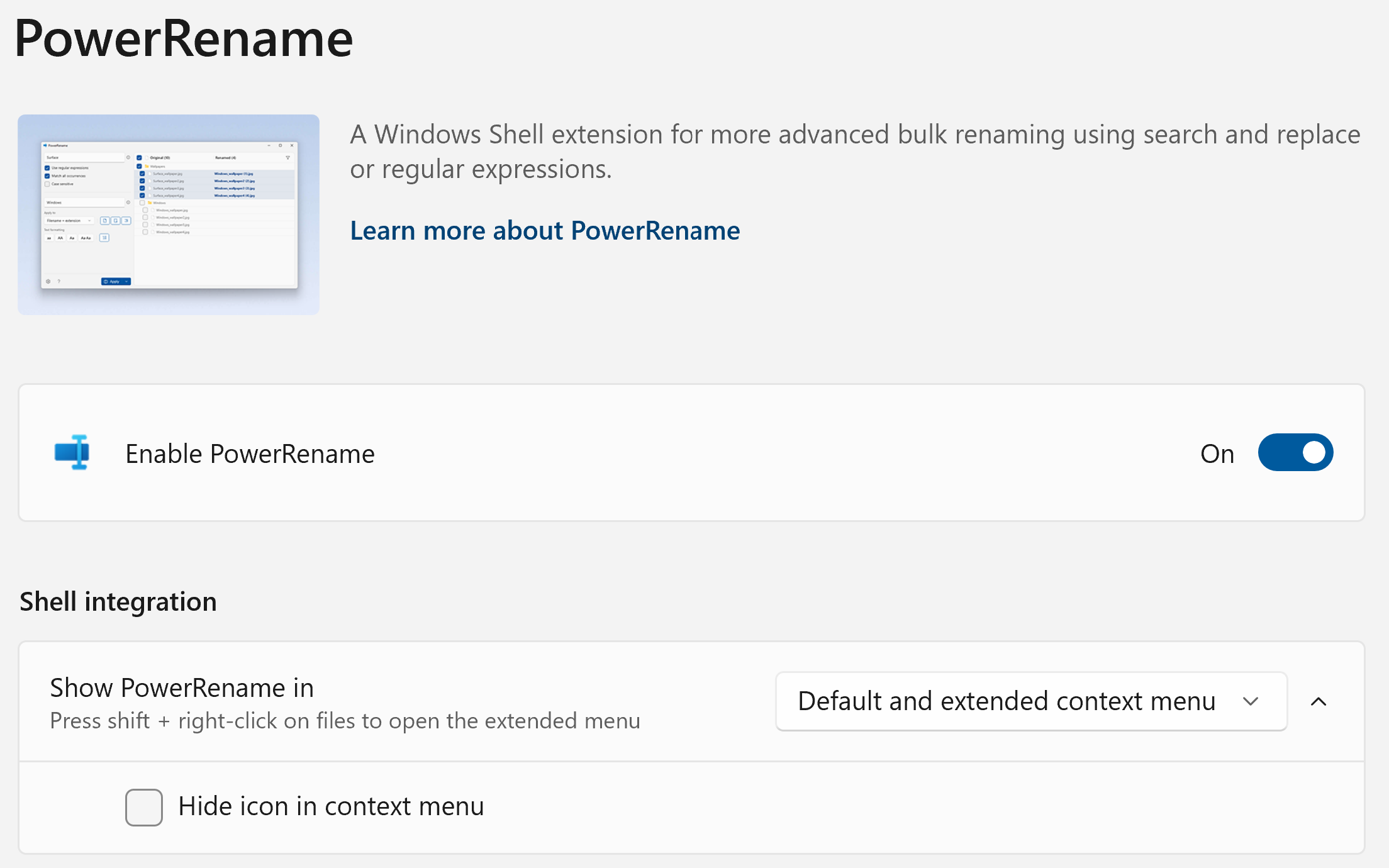 PowerRename can rename files, folders and subfolders en-masse, as long as the original files have identical sections of their name. This is particularly useful for image files you’d like to collate, such as photos from a holiday. For example, a large group of photos might all begin with “IMG” or “DCMI”. It essentially does a find-and-replace, similar to the Word feature.