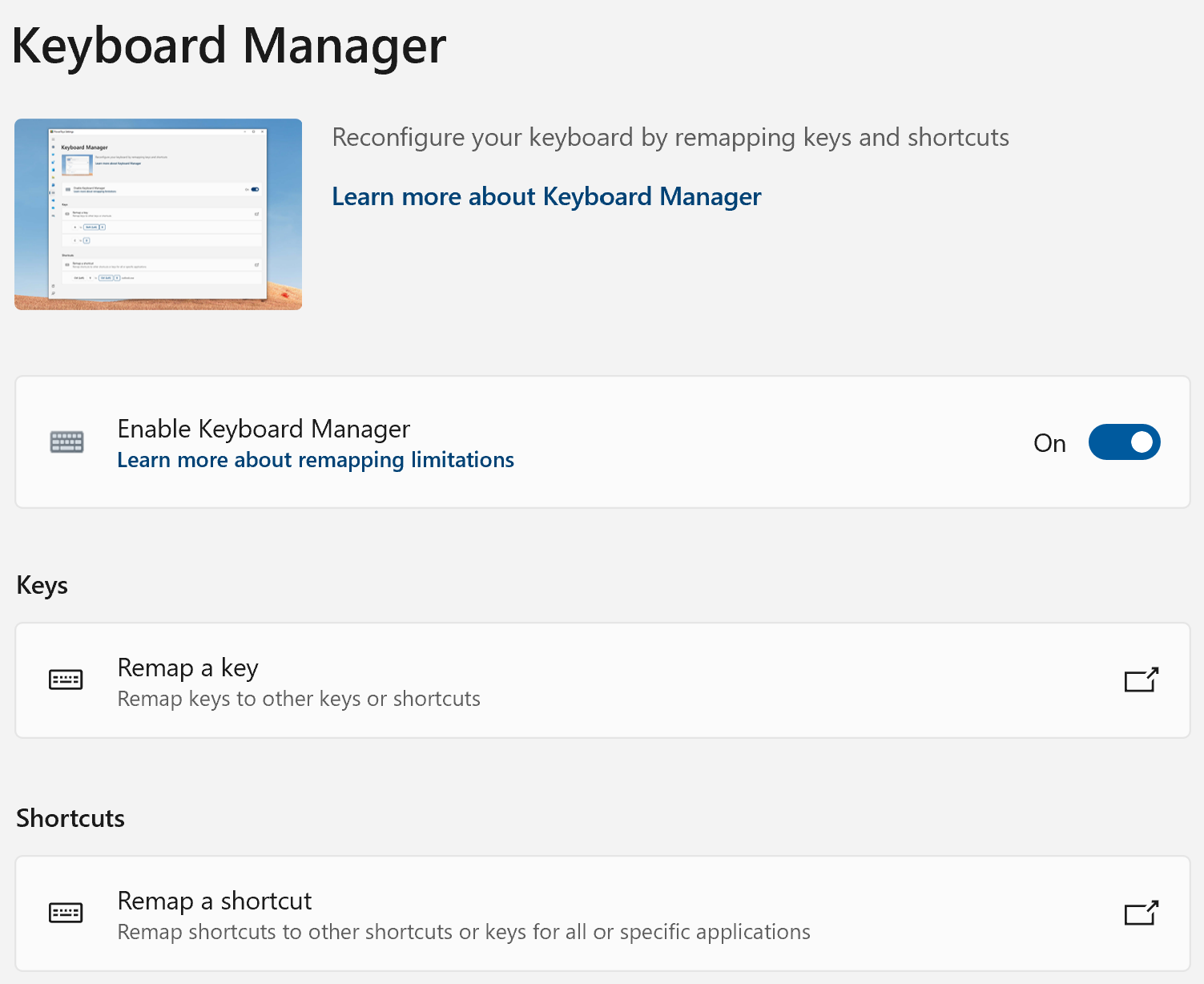 • Keyboard manager lets you remap keyboard keys or system shortcuts