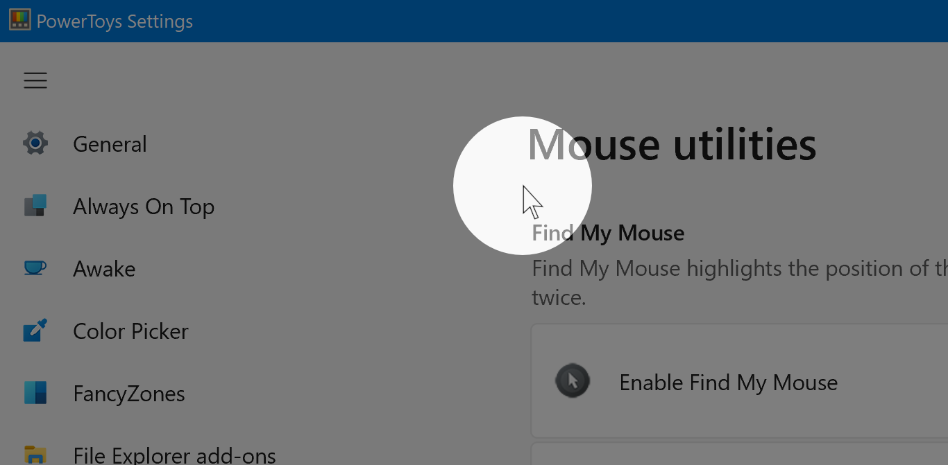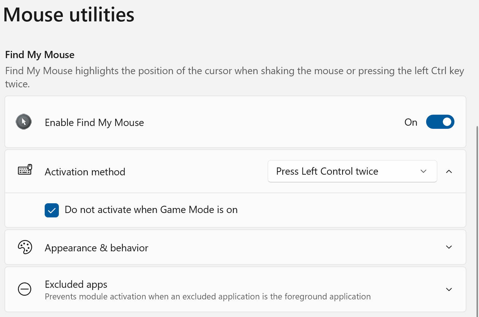 If you ever find yourself shaking your mouse to try and locate the cursor, Find My Mouse is the answer. Once PowerToys is installed, it’s on by default. Press Left Ctrl twice (or change it to Shake your mouse) and the screen will darken everywhere except for a spotlight around your cursor. You can exclude apps individually or have it deactivate while in Game Mode.
