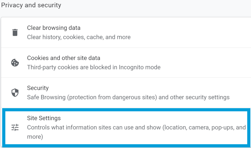 If there is a different icon to the right of an allowed or blocked website (i.e. no three vertical dots), it might be allowed or blocked by a browser extension. You will need to edit this status through the extension’s settings or by removing the extension.
