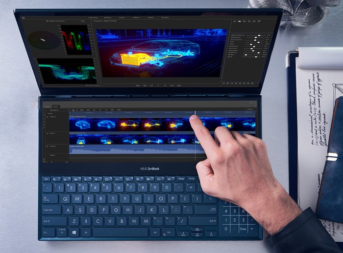 The 14-inch secondary screen, called ScreenPad Plus, has a resolution of 3840 x 1100 pixels, and extends the workspace provided by the 15.6-inch main screen, an OLED 4K (3840 x 2160 pixels) 16:9 touchscreen.
