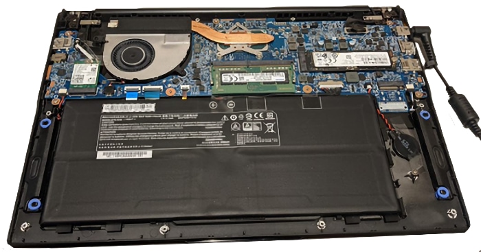 Many have the RAM and even the storage soldered in, so what you buy is what you’ve got for the life of the computer. The bottom panel can be removed easily to reveal the battery (which isn’t glued-in, as is the case with many), SSD (and spare slot), Wi-Fi module, and RAM slot.