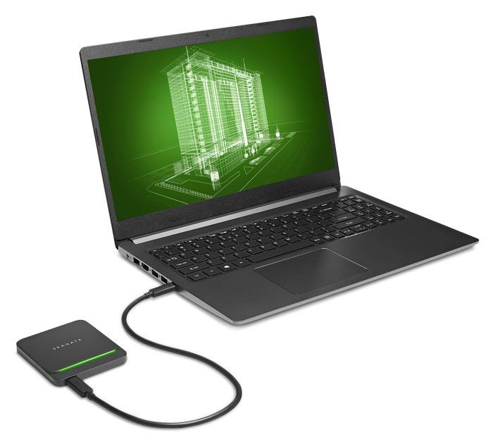 The Barracuda SSD, seen here attached to a laptop via USB-C (Gen2), is small and slim but provides fast access to plenty of data.