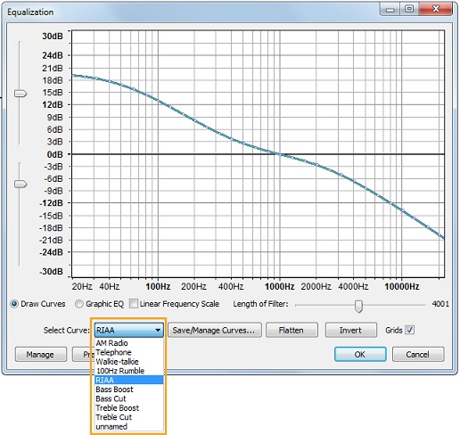 2. First, press Ctrl + A to highlight the waveform, then go to Effect > Equalization, click the dropdown menu next to Select Curve, click RIAA, then OK to apply the equalisation.