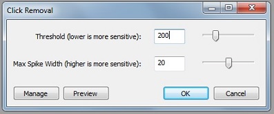 4. Next step is to remove clicks and pops. Go to Effect > Click Removal to set the click/pop limitations. Threshold detects clicks. A lower number will increase the detection sensitivity, but pushing it too far can cause Audacity to start removing elements from the music, damaging the sound quality. Spike width is similar, except a higher number equals greater sensitivity. Play with these settings and press Preview to hear a sample. Once you’re happy with the level of sensitivity, click OK to apply the settings.
