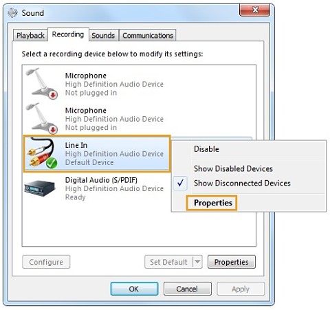 1. Right-click the Audio icon in the Taskbar next to the clock, click Recording devices. Look for a device with Line In in the description, right-click it and select Set as Default Device to ensure that your PC will only record audio from the turntable.