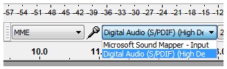 2. Look for four dropdown menus towards the right side of the Toolbar, and click the second dropdown menu, that’s adjacent to MME. The second toolbar will display a list of input devices. Select the option that includes Digital Audio (S/PDIF) in the title. The surrounding text will vary depending on your computer and turntable model. If this isn’t available, select the first available option then follow the steps in Test the settings. If the waveform doesn’t appear, stop recording and pick another option from the dropdown menu.