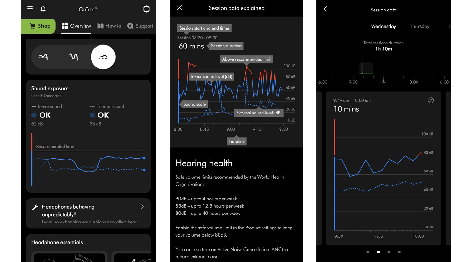 The MyDyson app includes a ‘Sound exposure’ section which monitors your listening volume in real time. Rolling graphs record decibel data when you’re using the headphones (as long as the app is installed on that device) so you can see when you’re within, or exceeding, safe listening levels.
