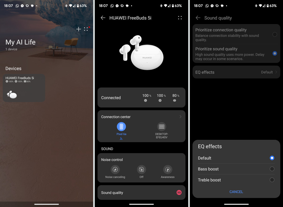 The FreeBuds 5i are controlled via the Huawei AI Life app, which you might need to side load if you’re an Android user (i.e. download it via a browser, rather than the Google Play app store).