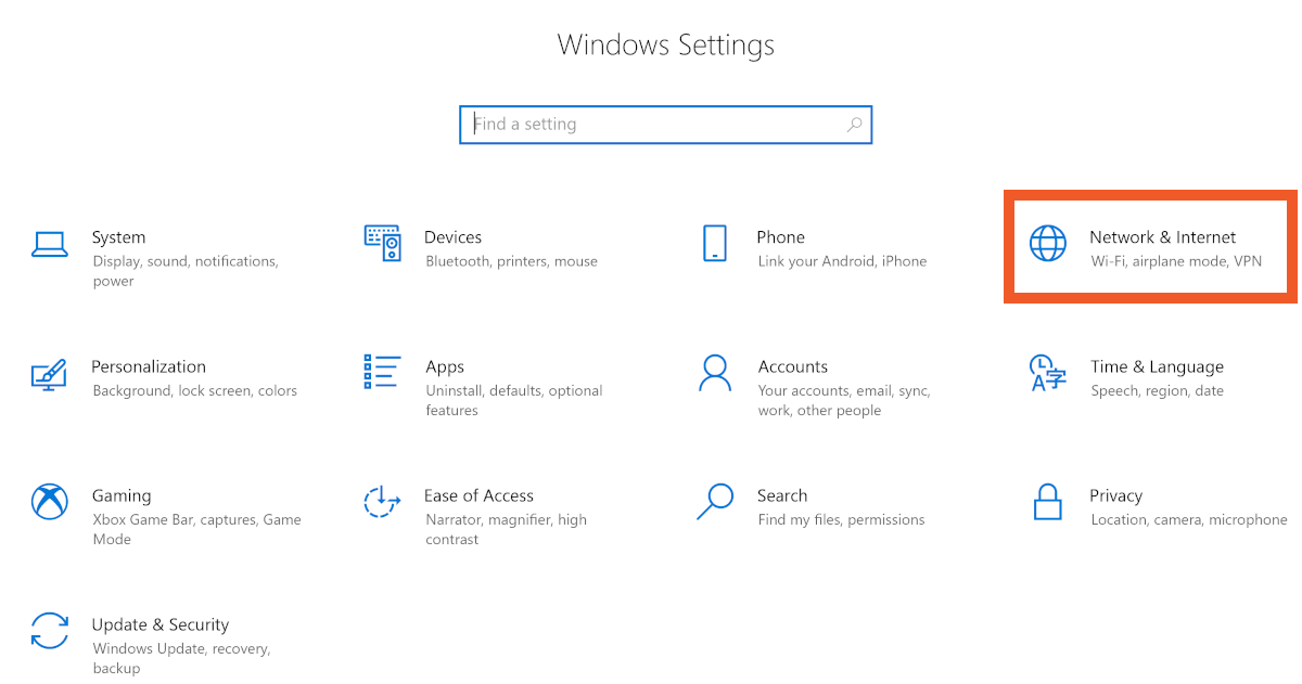 Changing the DNS settings for a Windows device is easy. Go to your Start menu > Settings > Network & Internet.