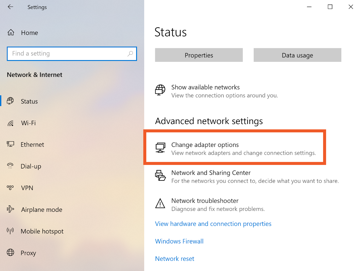 Scroll down to “Advanced network settings” and click Change Adapter Options.Â