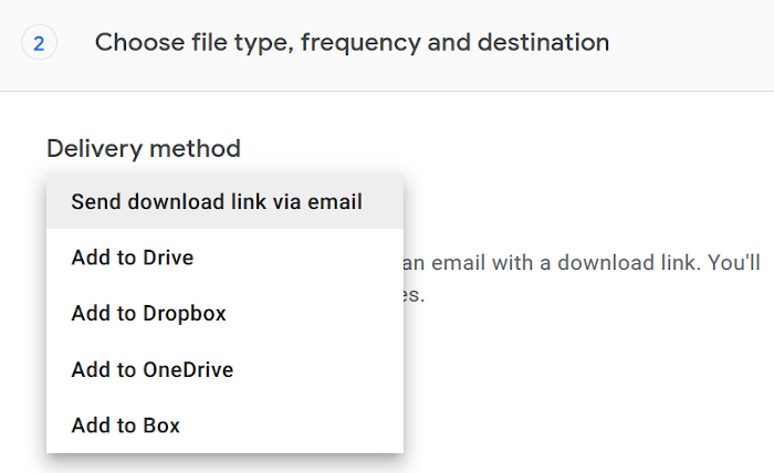 To choose where the exported data goes, such as a direct download or exporting to another cloud service, click Delivery method. Choose between Send download link via email (a direct download to your PC or Mac’s storage drive), Add to Drive, Add to Dropbox, Add to OneDrive, or Add to Box.