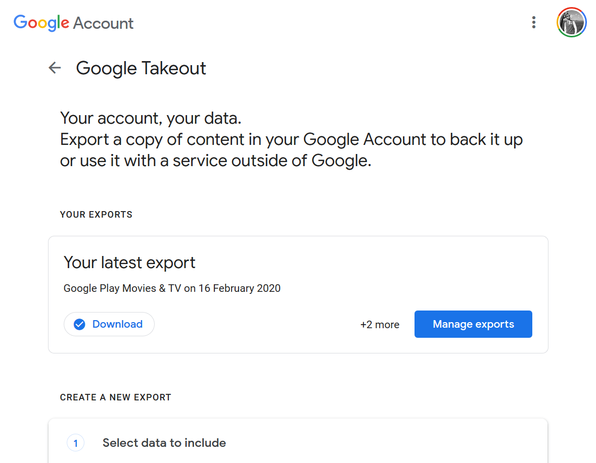 Note: if yours is a business Google account, you might not have permission to export any data via Takeout. Ask your IT department if this is the case.