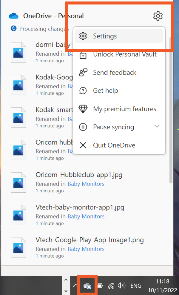 To sync Documents, Pictures and Desktop, left-click on the OneDrive icon in your system tray (bottom right of your main display) and click the Settings icon (a cog), then select Settings.