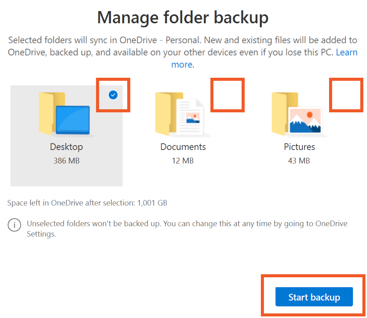 In the Backup tab, click Manage backup. Tick which of these three options you’d like to automatically sync with OneDrive, then click Start backup.
