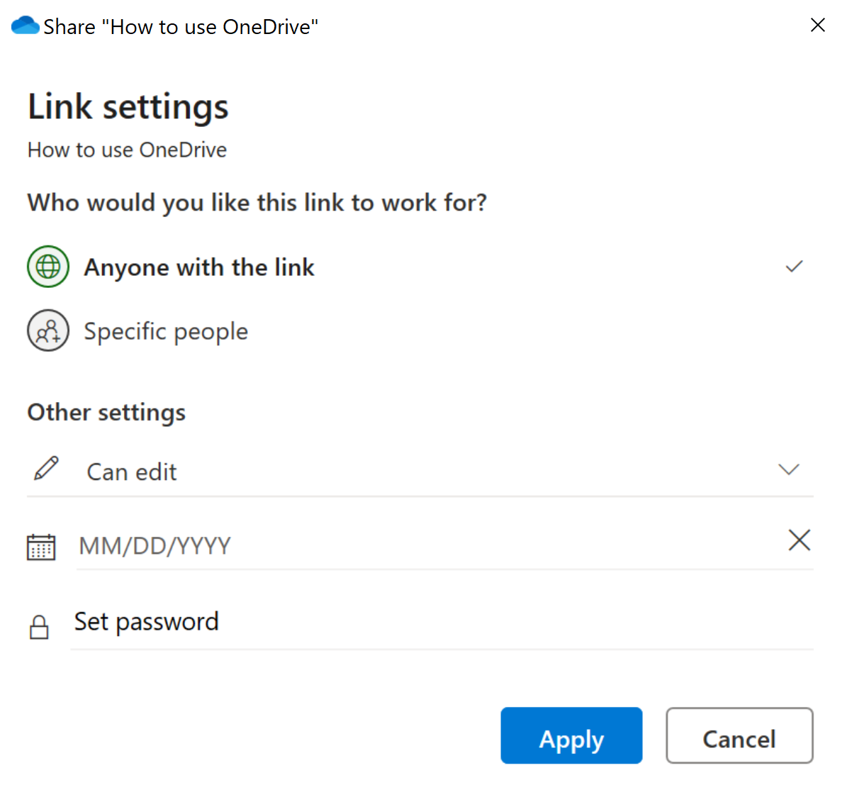 You can share OneDrive folders, but not individual files, with other people via their Microsoft accounts. When sharing a folder, you choose to share it with anyone who has the link, or with specific people. You can also grant them permission to edit or only view the content of your folder, set a password, and enter an expiry date for access.