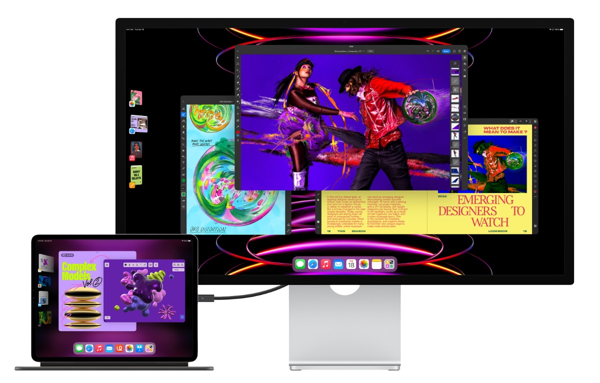 Connecting the iPad Pro to an external display and enabling iPadOS 16’s Stage Manager multitasking option provides a multi-screen desktop experience.